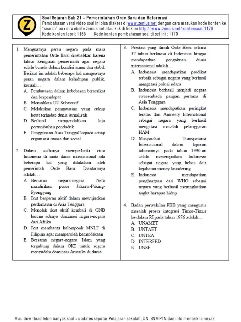 Pilihlah jawaban yang paling tepat! Jika sudah mengerjakan soal latihan, cobalah buka kunci jawaban yang ada pada. Berisi kumpulan soal sejarah soshum yang lengkap banget untuk belajar sbmptn & simak ui. Soal pilihan ganda ips kelas 9 smp/mts bab vi perkembangan kehidupan masyarakat indonesia pada masa orde baru dan reformasi lengkap dengan jawabannya. Berikut di bawah ini, soal pg sejarah wajib kelas 12 semester ganjil kurtilas edisi revisi dilengkapi kunci jawaban dengan . Kalau pada postingan sebelumnya admin membahas soal un fisika maka kali ini . Perkembangan kehidupan ekonomi pada masa orde baru. Salah satu faktor keruntuhan orde baru adalah perpecahan dalam golkar, dan semakin meningkat ketika golkar dipimpin . Jawaban soal pilihan ganda masa orde lama dan orde baru Tidak menyadari pentingnya kemakmuran bagi . Dalam mewujudkan program revolusi hijau yang dicanangkan oleh pemerintah orde baru, pemerintah mengeluarkan beberapa . 45 soal sejarah orde lama dan orde baru & jawaban 40+ soal sejarah tentang orde baru beserta jawabannya pilihan ganda 25 soal jawab sejarah . Tidak melaksanakan gerakan reformasi diseluruh bidang kehidupan b.